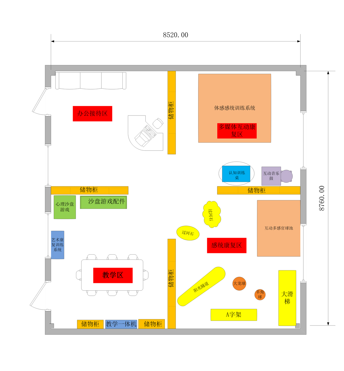 功能说明:用于对学生的心理辅导与训练,情绪疏导与放松,可用作心理疏导的核心区域。