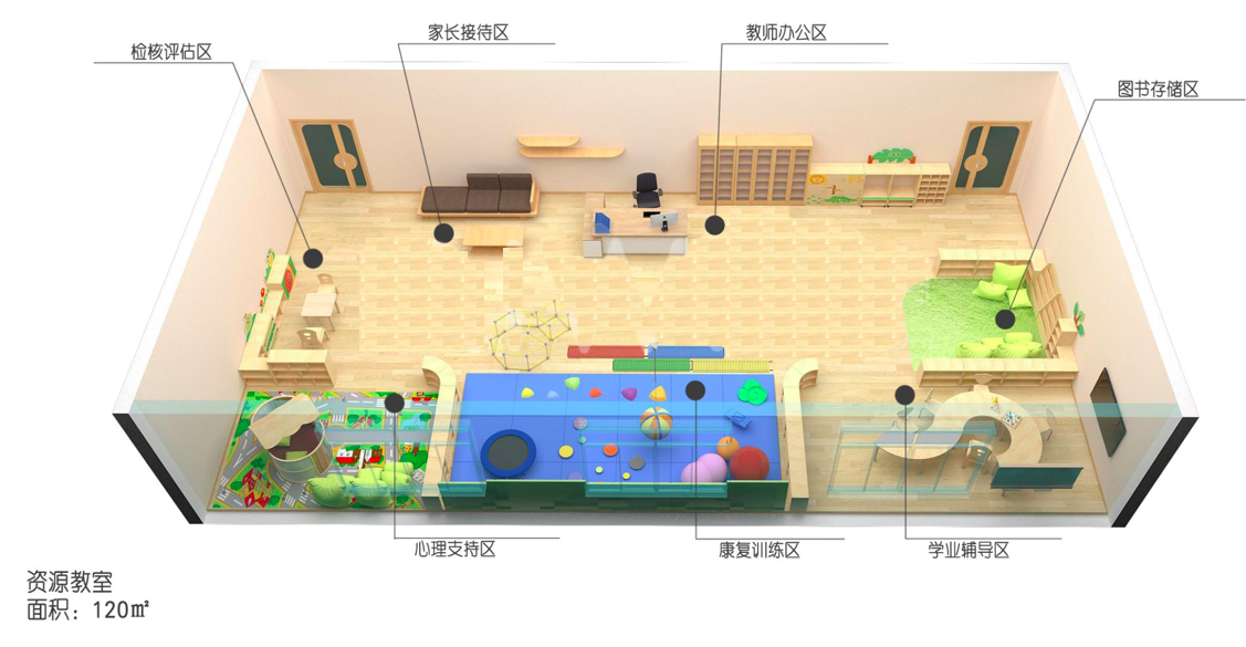 根据教育部办公厅《普通学校特殊教育资源教室建设指南》的相关规定,结合建设资源教室的实际需求,资源教室功能分区可划分为五大区域:家长接待区、教师办公区、学业辅导区、康复训练区、心理支持区。各区域承担不同的教育教学功能。